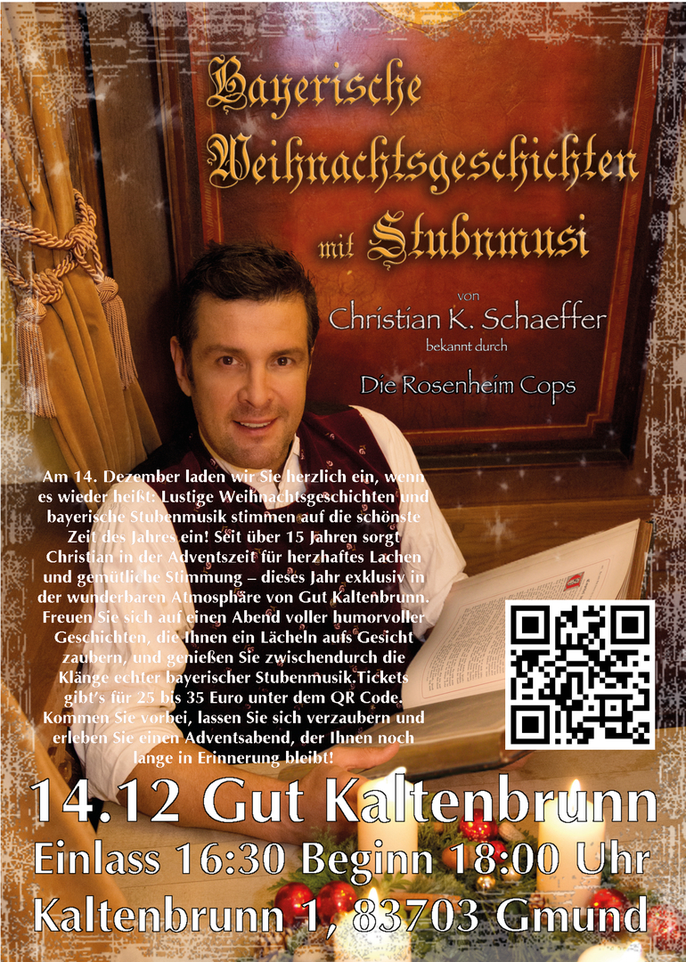 Am 14. Dezember laden wir Sie herzlich ein, wenn es wieder heißt: Lustige Weihnachtsgeschichten und bayerische Stubenmusik stimmen auf die schönste Zeit des Jahres ein! Seit über 15 Jahren sorgt Christian in der Adventszeit für herzhaftes Lachen und gemütliche Stimmung – dieses Jahr exklusiv in der wunderbaren Atmosphäre von Gut Kaltenbrunn. Freuen Sie sich auf einen Abend voller humorvoller Weihnachtsgeschichten, die Ihnen ein Lächeln aufs Gesicht zaubern, und genießen Sie zwischendurch die Klänge echter bayerischer Stubenmusik. Beginn ist um 18:00 Uhr, Einlass bereits ab 16:30 Uhr, und Tickets gibt’s für 25 bis 35 Euro. Kommen Sie vorbei, lassen Sie sich verzaubern und erleben Sie einen Adventsabend, der Ihnen noch lange in Erinnerung bleibt!